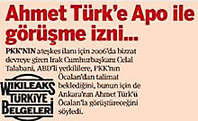 Wikileaks belgelerini yayımlayan Taraf gazetesi, PKK’nın ateşkes ilanı için 2006’da bizzat devreye giren Irak Cumhurbaşkanı Celal Talabani'nin, ABD’li yetkililere, PKK’nın Öcalan’dan talimat beklediğini, bunun için de Ankara’nın Ahmet Türk’ü Öcalan’la görüştüreceğini söylediği belgeyi yayımladı.