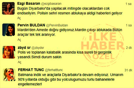 Sosyal medyada ise Diyarbakır'a ulaşmaya çalışanlar ve miting alanında olanlar tarafından gelişmeler anlık olarak twitleniyor. İşte onlardan bazıları...