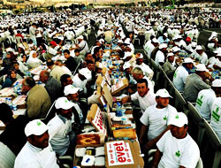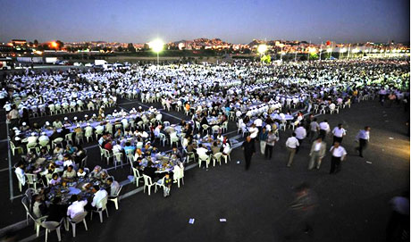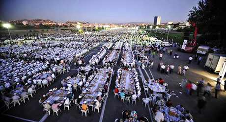 İftar için toplam 8 ton et, 5 ton pirinç, 2 ton nohut kullanılırken, 60 bin pide, 60 bin ayran, 120 bin şişe su ile hurma, zeytin, tereyağ ve baldan oluşan iftariyelik hazırlandı.