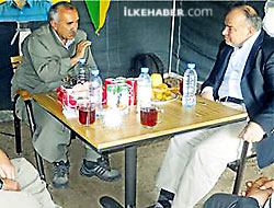 “Geldik” diyor Deniz. Öndeki arabanın durmasından belli geldiğimiz. İniyoruz. Ortalıkta bizden başka kimse yok. Dik bir yamaçtan aşağı yürüyerek inmeye başlıyoruz. Yirmi-otuz adım sonra yerden bitmişçesine silahlı PKK elemanları çıkıyor ortalığa. Aralarından ilerliyorum. Düzlük bir yerde Murat Karayılan bekliyor. Yanında uzun yıllar cezaevinde yatmış biri var. Elini uzatıp “Hoşgeldin” diyor. İşaret ettiği yerde bir tür kamp çadırı var. Önü tamamen açık. İçi çalışma odası tarzına uygun masa düzenini yansıtıyor. Karayılan’ın oturduğu sandalyenin gerisinde Öcalan’ın resmi, PKK bayrağı var. Masanın üzerinde sıradan meyve ve içecekler.