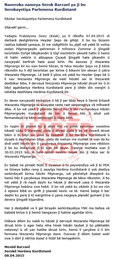 Barzani yasalar gereği, Peşmerge Bakanlığı dışında bölgede farklı hiç bir gücün örgütlenmesine izin verilmeyeceğini dile getirerek mektubunda şu ifadeleri kullandı: