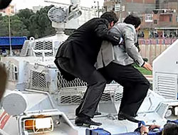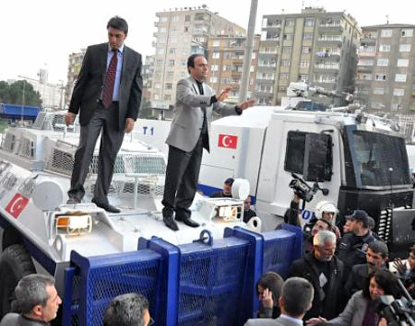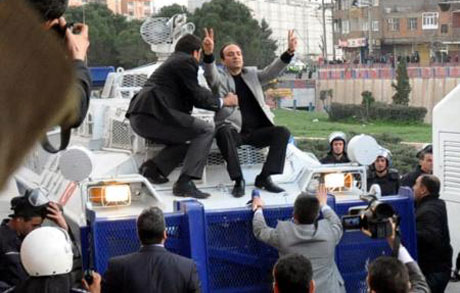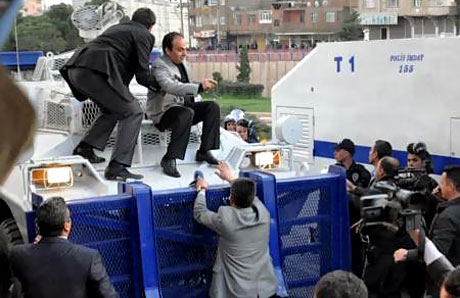 Barış ve Demokrasi Partisi (BDP) ile Demokratik Toplum Kongresi'nin (DTK) 'sivil itaatsizlik' adı altında başlattığı oturma eyleminde polis panzerine çıkan Diyarbakır Belediye Başkanı Osman Baydemir'i düşmekten koruması kurtardı.