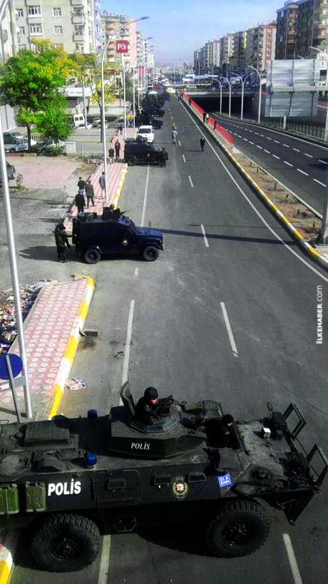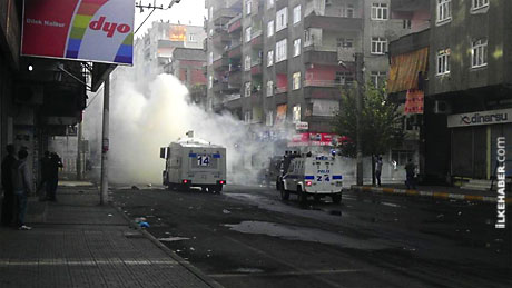 Diyarbakır'ın merkez Bağlar ilçesindeki Fatih Mahallesi Göçmenler Caddesi üzerinde açlık grevi için toplanan kitleye polis, tazyikli su ve gaz bombalarıyla müdahale etti. Polis müdahalesine taşlarla karşılık verilmesi üzerine çatışma çıktı. Cadde üzerindeki olaylar devam ediyor. (imc -Foto: Zübeyde Sarı)
