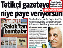 İçişleri Bakanı İdris Naim Şahin’e bakın. Bir bakan kalkıp ‘Şemdinli’deki havan mermilerinden daha zararlı olan Ankara’dan, İstanbul’dan yazılan köşe yazılarıdır’ dediği anda ertesi gün Akit’te böyle bir şeyin çıkması çok şaşırtıcı bir şey olabilir mi! Böyle bir İçişleri Bakanınız olursa, böyle haberler yapan gazeteniz olur. Dün (önceki gün) yaptığını uzun zamandır yapmakta olan bir gazete, başbakanın her gezisinde başköşede ağırlanırsa nereden alabilir bu gücünü. Hedef aldığı kişiler de başbakan tarafından çizilmiş oluyor. O zaman bu gazete bunu gayet rahat yapar. Arkasında bir iktidar güvencesi hisseder. Devletle veya hükümetle bir ilişkisi var tabiî ki.