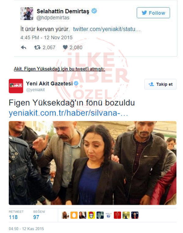 Demirtaş, Eş Genel Başkan Figen Yüksekdağ’ın da aralarında bulunduğu HDP heyetinin Diyarbakır’ın Silvan ilçesinde polis müdahalesiyle karşılaşmasının ardından Yeni Akit gazetesinin "Figen Yüksekdağ'ın fönü bozuldu" başlıklı haberini eleştirerek, “İt ürür kervan yürür” açıklamasında bulundu.