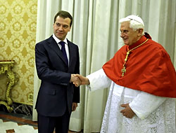 Siyasi ve dini konuların ele alındığı görüşmede Medvedev, Papa Benedict'e kapağında Kremlin'in panoramik resminin bulunduğu Ortodoks Hristiyan ansiklopedisinin yeni basımını hediye etti. Papa Benedict ise, Medvedev'e St. Peter Bazilikası'nı tasvir eden bir gravür verdi.