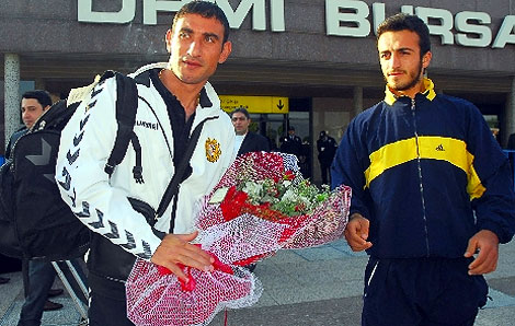 Uluslararası Yenişehir Havaalanı'na inen Ermenistan kafilesi, Türkiye Futbol Federasyonu yetkilileri ve Yenişehir Belediyesporlu futbolcular tarafından çiçeklerle karşılandı.