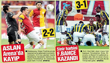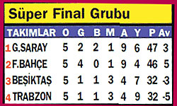 Süper Final Şampiyonluk Grubu'nda Fenerbahçe, Trabzonspor'u 3-1 mağlup ederek şampiyonluk yolunda büyük avantaj yakaladı. 3. dakikada Cristian'ın ara pasında savunmanın arkasında topla buluşan Emre, meşin yuvarlağı yerden bir vuruşla filelere gönderdi: 0-1. 31. dakikada Emre'nin pasında Tolga ile karşı karşıya kalan Stoch'un şutu çizgi önünden Serkan çıkardı. Ancak yetişen Bienvenu, Giray'dan sıyrılarak Tolga'nın sağından meşin yuvarlağı filelere gönderdi: 0-2. 45+4. dakikada Olcan'ın ortasında Burak, yerden bir vuruşla topu filelere göndererek farkı 1'e indirdi: 1-2. 58. dakikada Dia, bomboş pozisyonda topu Tolga'ya nişanladı. 70'de Burak'ın frikiğini Volkan nefis çıkardı. 84. dakikada defansın arkasında sarkan Cristian Cristian Baroni, skoru 3-1 yaptı. Maçta Fenerbahçe'nin galibiyetiyle sona erdi.