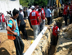 Kur'an-ı Kerim tilavetiyle başlayan törende Mavi Marmara gemisinde hayatını kaybedenlerin ruhuna Fatiha okundu. Kızılay Gazze ekibi Başkanı Şafak Lostar, "Filistin'de süregelen insani krizi her daim yakından takip eden ve tüm boyutlarıyla ele alan Türk Kızılayı, yaşanan insani ıstırabı dindirme adına Türk halkının verdiği destekle her zaman Filistin halkının yanında olacaktır" dedi. Su kuyuları, Türk ve Filistin bayraklarının yanı sıra Kızılay flamalarıyla süslenen bölgede törenle hizmete açıldı. Gazze'deki su şebekesinin yüzde 80'inin yenilenmesini üstlenen Kızılay, 3,35 milyon dolar ayırdığı bu proje için 6 ayrı çalışma yapacak. Açılan üç su kuyusu, bu projenin üçüncü adımını oluşturuyor.