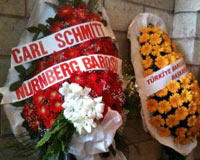"Carl Schmitt - Nurnberg Barosu" yazılı çelenk, Özbek'in ödül aldığı salonu konuldu.
