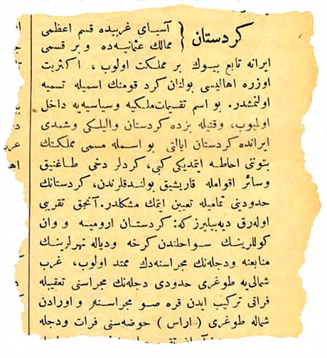 “Asya-yı garpta kısm-ı azamı İran’a tabi büyük bir memleket olup, ekseriyet üzere ehalisi bulunan Kürt kavminin ismiyle tesmiye olunmuştur. Bu isim taksimatı mülkiye ve siyasiyete dâhil olup, vaktiyle bizde Kürdistan Valiliği ve şimdi İran’da Kürdistan eyaleti bu isimle müsemma memleketin bütününü ihata ettiği gibi, Kürtler dahi dağınık vesair akvamla karışık bulunduklarından Kürdistan’ın hududunu tamamıyle tayin etmek müşkildir”.