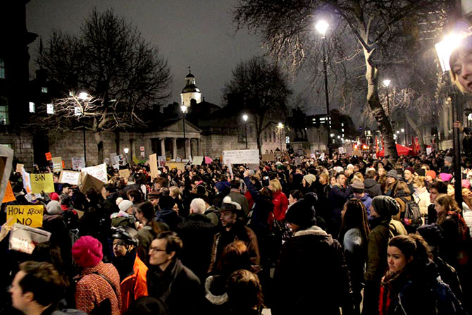 “Trump yasağına hayır” ve “Hepimiz göçmeniz” sloganları atan Londralılar, “Donald Trump’ın gitmesi gerekiyor” ve “Yüz karası May” diyerek İngiltere Başbakanı’na da Trump’a verdiği destek nedeniyle tepki gösterdiler.