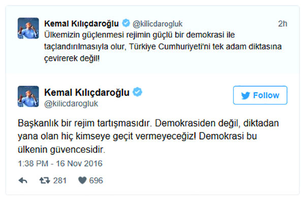 “Ülkemizin güçlenmesi rejimin güçlü bir demokrasi ile taçlandırılmasıyla olur, Türkiye Cumhuriyeti’ni tek adam diktasına çevirerek değil! Başkanlık bir rejim tartışmasıdır. Demokrasiden değil, diktadan yana olan hiç kimseye geçit vermeyeceğiz! Demokrasi bu ülkenin güvencesidir.”