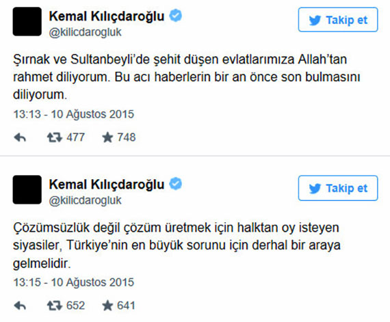 Kılıçdaroğlu, “Şırnak ve Sultanbeyli’de şehit düşen evlatlarımıza Allah’tan rahmet diliyorum. Bu acı haberlerin bir an önce son bulmasını diliyorum. Çözümsüzlük değil çözüm üretmek için halktan oy isteyen siyasiler, Türkiye’nin en büyük sorunu için derhal bir araya gelmelidir” ifadelerini kullandı.