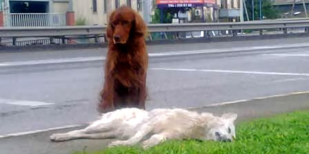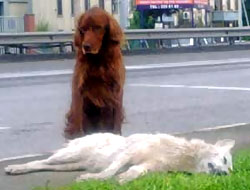Kocaeli'nde bir aracın çarpmasıyla ölen köpeğin başında saatlerce bekleyen Seter cinsi köpek, vefanın ve dostluğun ne olduğunu bir kez daha gözler önüne serdi.