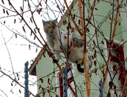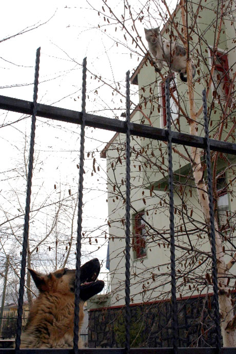 Kars-Ardahan Barosu Ardahan Temsilcisi Avukat Müzeyyen Çiftçi Yolaçan'ın Karagöl Mahallesi'ndeki evinin bahçesine giren bir sokak kedisi, bahçedeki köpeğin saldırısından kurtulmak iç in ağaca tırmandı.