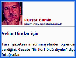Taraf gazetesinin sürmanşetinden öğrendim Selim Dindar'ın bir "kör kurşunla" can verdiğini. Gazete "Bir Kürt öldü diyeler" diyor. Altında Selim Dindar'ın ve oğlunun fotoğrafları.