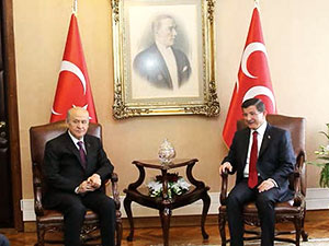 AK Parti Genel Başkanı ve geçici Başbakan Ahmet Davutoğlu, MHP Genel Başkanı Devlet Bahçeli ile koalisyon görüşmeleri kapsamında bir araya geldi. Görüşmenin ardından AK Parti Genel Merkezi’nde basın toplantısı düzenleyen Davutoğlu’nun yaptığı açıklamaya göre Bahçeli’nin AK Parti ile koalisyonu düşünmediklerini belirttiğini söyledi.