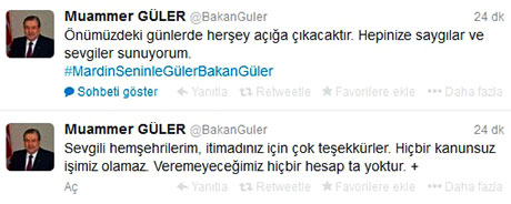 Bakan Güler, resmi Twitter hesabındaki açıklamada, 'Önümüzdeki günlerde her şey açığa çıkacaktır. Hepinize saygılar ve sevgiler sunuyorum. Sevgili hemşehrilerim, itimadınız için çok teşekkürler. Hiçbir kanunsuz işimiz olamaz. Veremeyeceğimiz hiçbir hesap da yoktur' ifadelerini kullandı.