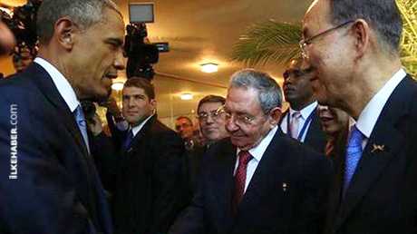 Obama ile Castro Panama'da düzenlenen 7'nci Amerika Zirvesi başlamadan önce el sıkıştı. AFP tarafından servis edilen fotoğrafta, el sıkışmanın BM Genel Sekreteri Ban Ki-Moon ile diğer liderlerin meraklı bakışları arasında gerçekleştiği görülüyor.
