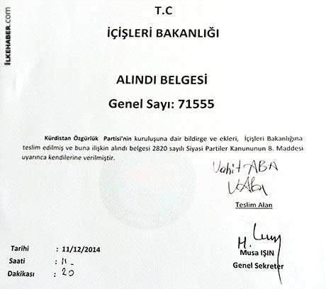Partiya Azadiya Kurdistanê(PAK-Kürdistan Özgürlük Partisi) İçişleri Bakanlığından parti kuruluşu ile ilgili olarak daha önce verilmeyen ‘’alındı belgesi’’ni bugün teslim aldı.