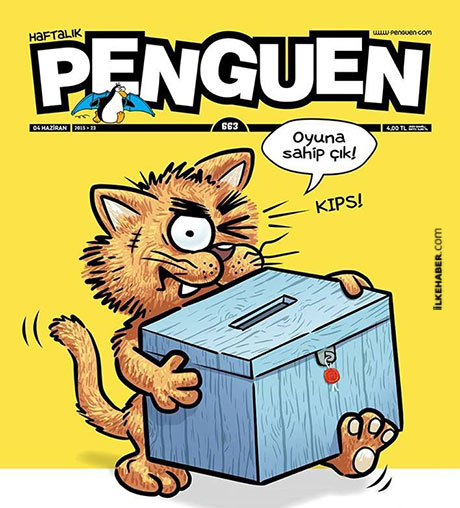 Pazar günü yapılacak genel seçimlerde sandık güvenliği için yolsuzluklara karşı önlemler tartışılırken, haftalık mizah dergisi Penguen'in kapağında bir kedi kucağındaki sandık ile "oyuna sahip çık" mesajı verdi.