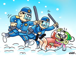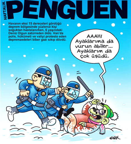 Mizah dergisi Penguen, deprem bölgesinde yaşananları ve Van Valisi'ni protesto edenlere polisin uyguladığı şiddeti kapağına taşıdı.