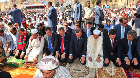 Erdoğan daha sonra Cuma namazı için eski adıyla Yeşil Meydan yeni adıyla Şehitler Meydanı’na gitti. Erdoğan, burada okunan hutbenin ardından geniş bir cemaatle birlikte namaz kıldı. Erdoğan, isyan sırasında hayatını kaybeden Libyalılar için taziyelerde bulundu. Birçok Libyalı’nın Erdoğan’a ulaşmaya çalışması nedeniyle izdiham yaşandı.