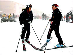 İki lider tatilcilerle yaptıkları kısa sohbetin ardından kış sporlarında da başarılı olduklarını gösterdiler.