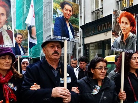 Çelenklerin arkasında Sakine Cansız’ın abisi ve kızkardeşi, Fidan Doğan’ın anne ve babası ile Leyla Şaylemez’in yakınları ve mücadele arkadaşları, ellerinde katliamda hayatını kaybedenlerin fotoğraflarıyla omuz omuza yürüdüler.