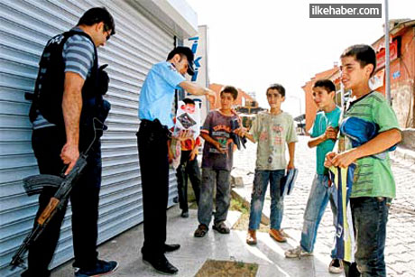 Zırhlı araçlarla tören alanı ve çevresinde yoğun önlemler alan güvenlik görevlilerinin, çocuklara şeker dağıtmaları dikkat çekti.