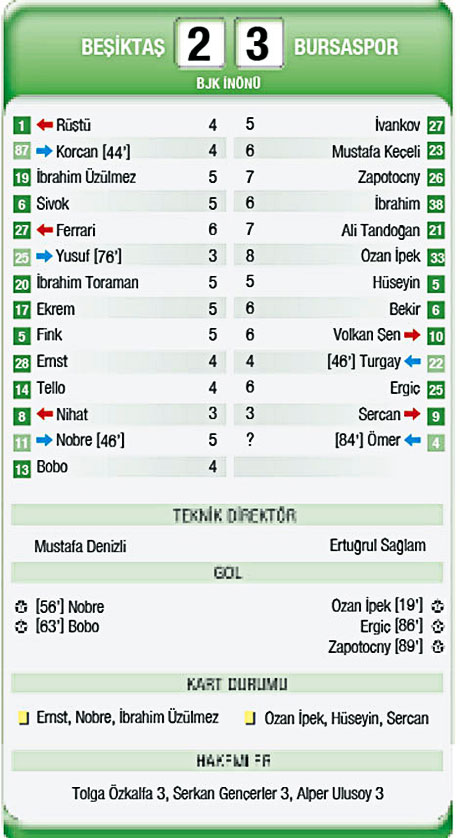 Bu dakikadan sonra yağmurun durmasıyla topa daha çok hakim olan Kara Kartal 58'de Nobre'nin kafa şutuyla skora denge getirdi. Taraftarın da desteğiyle baskıyı artıran Beşiktaş'ta 65'te İbrahim Toraman'ın kendisini atmasıyla kazanılan penaltı atışını Bobo gole çevirdi. 2-1. 85'te Ömer'in indirdiği topa Ergiç düzgün bir vuruş yapınca skora bir kez daha denge geldi. 2-2. Ancak konuk ekip Bursa'nın bir sürprizi vardı. Ozan'ın ortasına Zapotocny kafayı vurarak bir kez daha Bursa'yı öne geçirdi: 2-3.