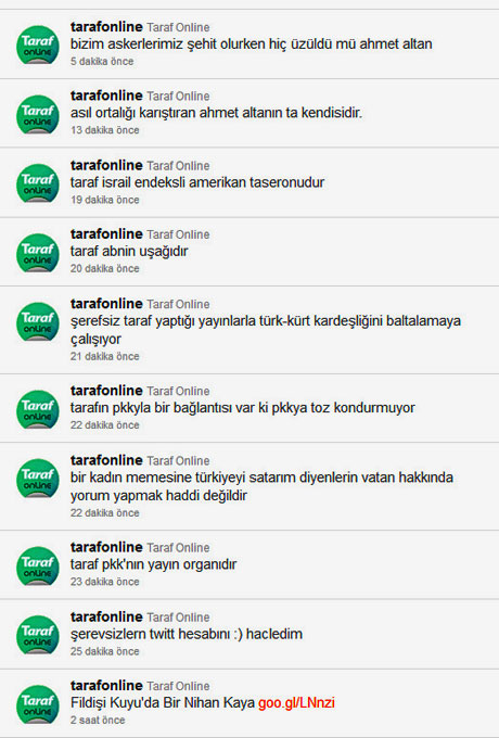 Hackerler Taraf gazetesinin Twitter’daki "tarafonline" ismindeki hesabında,Taraf gazetesinin PKK ile ilişkili olduğunu ima eden mesajlar bıraktı. Taraf gazetesindeki haberlerin AB ve ABD'nin talimatıyla yapıldığını öne süren hackerler, attığı twitlerde Taraf gazetesine ağır hakaretler de bulundu.