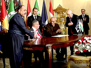 İmza törenine iki partinin yöneticileri, çok sayıda siyasetçi, YNK Genel Sekreteri Celal Talabani ve Goran Hareketi Genel Sekreteri Newşîrwan Mistefa katıldı.
