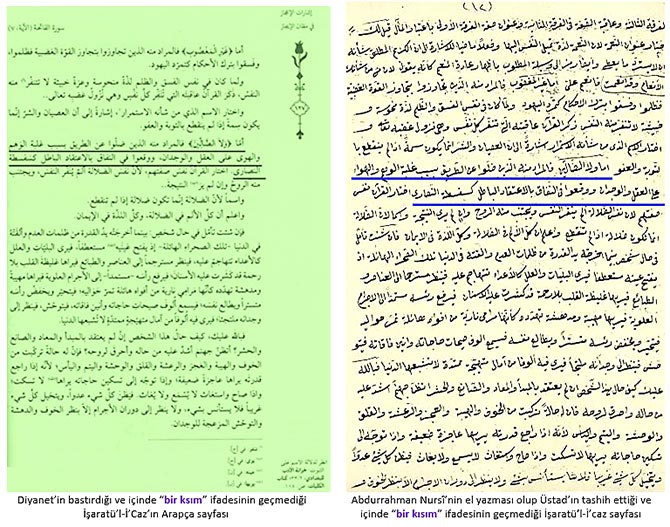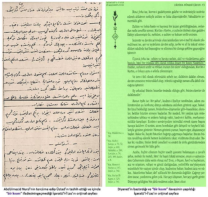 Abdülmecid Nursî’nin tercüme edip kendi eliyle yazdığı ve Üstad’ın da tashih ettiği “İşaratü’l-İ’caz” nüshasının 22’nci sayfasında geçen, “Vehim ve hevâ-yı nefsin akıl ve vicdanlarına galebesiyle, bâtıl bir itikada tâbi olarak nifaka düşen Nasârâdır" cümlesine, Diyanet’in baskısında, “bir kısım” ifadesi ilave edilerek, şöyle bir değişikliğe gidilmiştir: “Vehim ve hevâ-yı nefsin akıl ve vicdanlarına galebesiyle, bâtıl bir itikada tâbi olarak nifaka düşen bir kısım Nasârâdır" Şimdi, “bir kısım”ın ilavesiyle, “Nasara” ekseriyetinin “nifak”tan nasıl tahlis edildiğini fark ettiniz mi? Yani bir çeşit vaftizleme... (Belgeler aşağıdadır)
