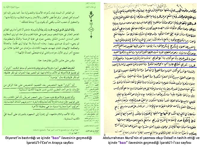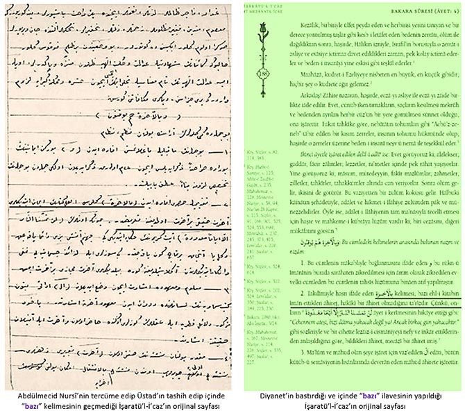 Belgelerde görüldüğü şekliyle, Diyanet’in bastırdığı İşaratü’l-İ’caz’ın altı çizili sayfasında “bazı ehl-i kitabın” ifadesindeki “bazı” orijinalinde yoktur; ilave edilmiştir. Bu ilave de, yine vaftizciliğin bir çeşidi olup ehl-i kitabın büyük ekseriyetini “hakiki ahiret inancının müminleri” yapmışlardır. Şimdi sormak hakkımız değil midir: Müellifin zikretmediği bir kelimeyi, cümle arasına sokuşturmakla, tefsirini çarpıtmaya ne hakkınız vardır? Bundan daha büyük saygısızlık olabilir mi? Hani ya, aslına sadık kalacaktınız? Bu mudur sadakat, bu mudur tedkikat?