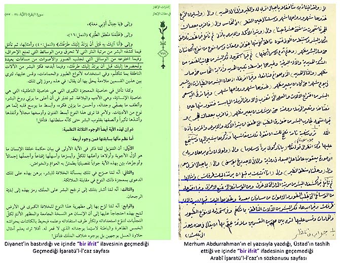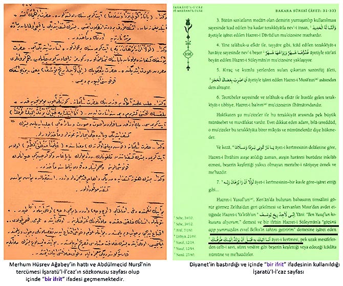 Merhum Hüsrev Ağabey’in kendi el yazısı ile yazılmış ve yine Merhum Abdülmecid Nursî’nin tercümesi olan İşaratü’l-İ’caz’ın 257’nci sayfasında geçen “Ve keza, celb ilmine agâh bir vezirinin, Hazret-i Süleyman’a: ‘Gözünü açıp yumuncaya kadar Belkıs’ın tahtını getiririm...” cümlesi, Diyanet’in baskısında (güya ki yeni tanziminde) “Bir ifritin Hazret-i Süleyman’a: ‘Gözünü açıp yummazdan evvel Belkıs’ın tahtını getiririm...” dönüştürülmüştür. “Celb ilmine agâh bir vezir” nerede, “Bir ifrit” nerede?!... (Belgeler aşağıdadır)